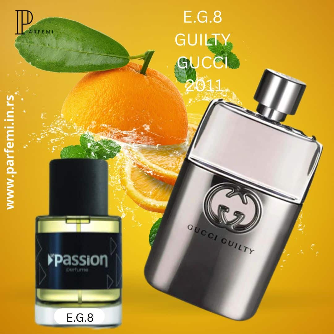 E.G.8 parfem po ugledu na GUILTY GUCCI 2011 koji odiše modernom elegancijom i smelošću. Pripada drveno-aromatičnoj kategoriji i poznat je po svojoj privlačnoj, zavodljivoj kompoziciji koja ističe muževnost i sofisticiranost.